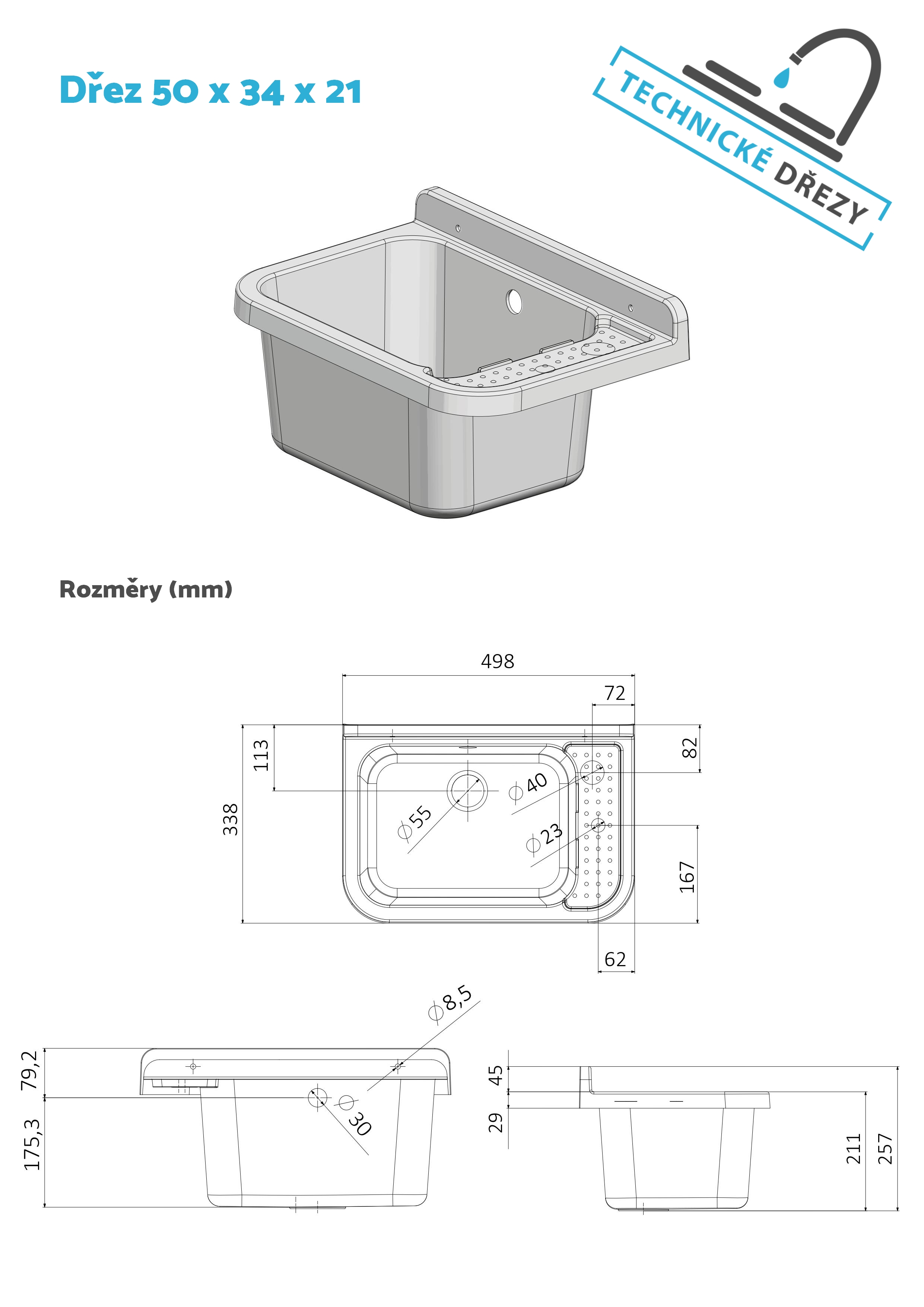 Technický jednokomorový dřez o objemu 13,5 litru je vyroben z leštěného PP plastu. Hlavní výhodou použitého materiálu je vynikající odolnost vůči mechanickým i chemickým vlivům a také schopnost odolávat vysokým teplotám a povětrnostním podmínkám.