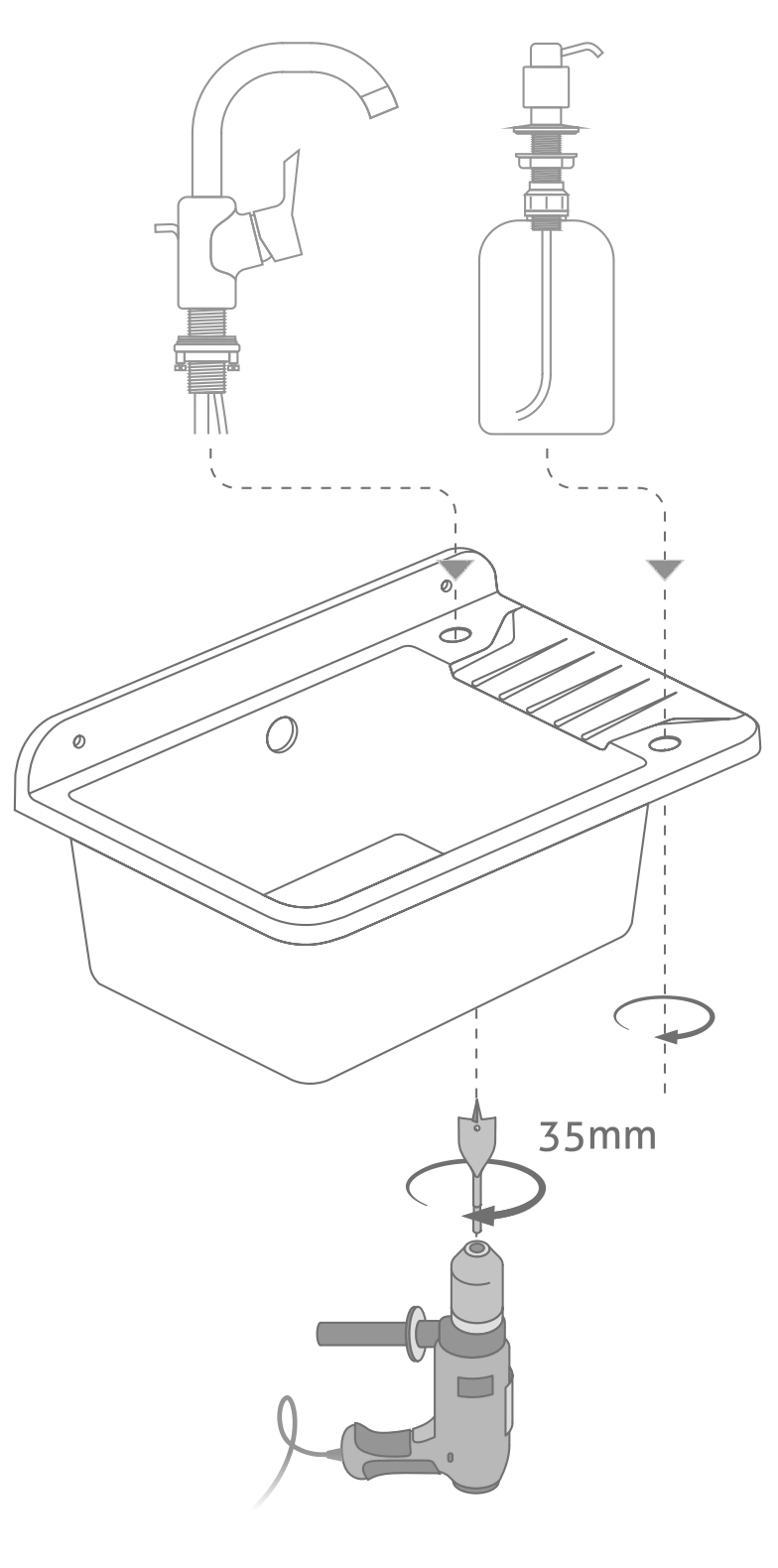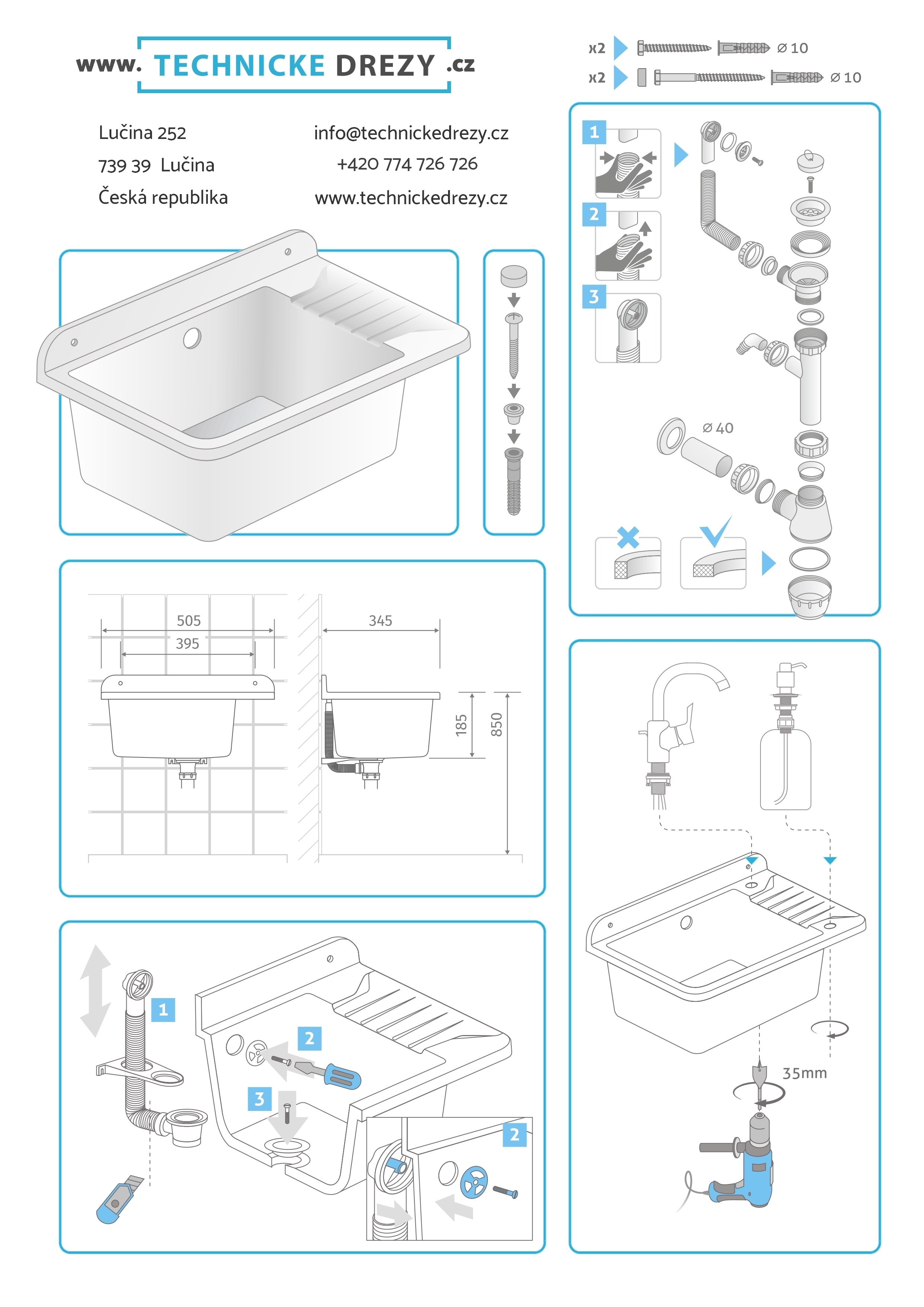 Nástěnný dřez je určen k montáži na zeď. S produktem je dodávána potřebná montážní sada spolu s odtokovou a přepadovou sadou.